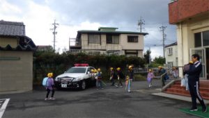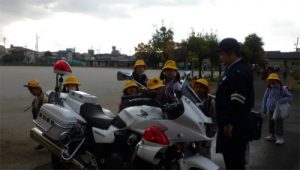 児童昇降口に停車していた白バイやパトカーを見て、子どもたちは、警察官の方に話しかけたり、質問したりしていました。