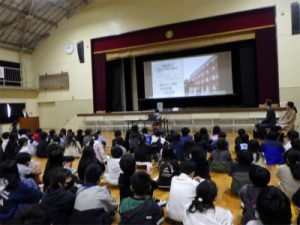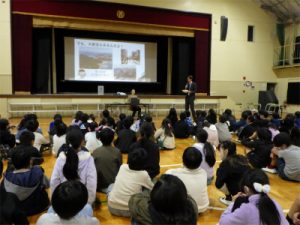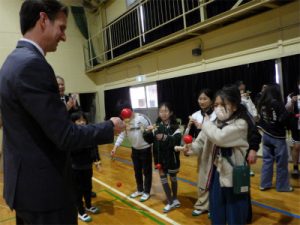 11月12日(水)に、3・4・5・6年生が、カナダ領事館との交流会を行いました。最初に、児童会の皆さんより、津島市や北小の紹介をしました。その後、日本の伝統的な遊びであるけん玉・お手玉・折り紙・たけうま・こま回しを、それぞれいっしょに体験しました。領事様から、カナダについて、風土や文化、スポーツのことなど、さまざまなお話を聞かせていただきました。また、万博のカナダパビリオンのお話もうかがいました。代表児童がお礼のことばを伝え、全員で「お陽さまになって」を歌いました。6年生の教室で、いっしょに給食を食べていただきました。カナダのことについてたくさん学ぶことができた、子どもたちにとって貴重な時間となりました。
