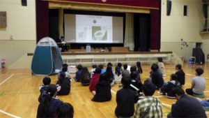 クイズに答えながら、防災について学んだ後、避難所に設置されるワンタッチテントや簡易トイレを、実際に触ったり、組み立てたりして体験しました。